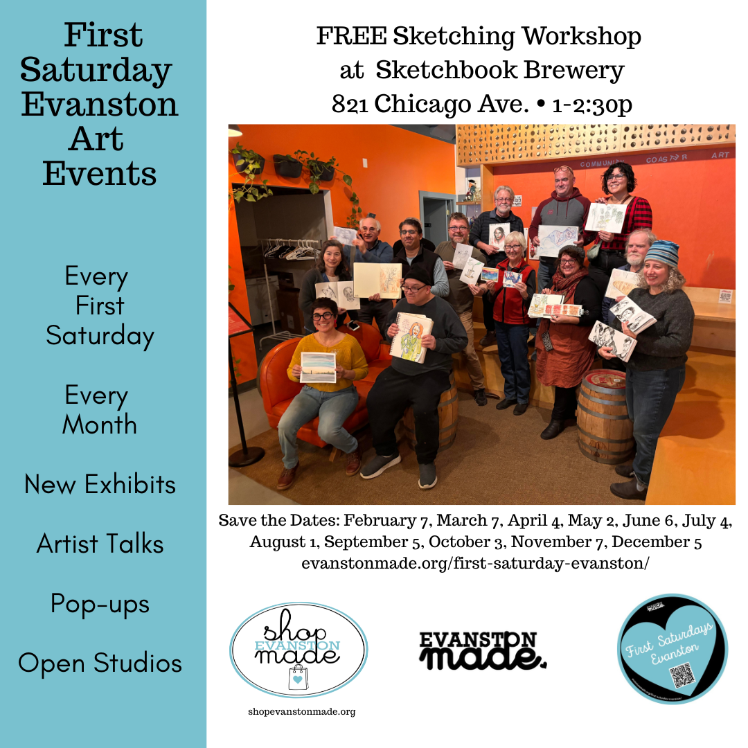 Evanston Made presents First Saturday Evanston Art Events. See art on display, shop for art and handmade goods, learn to sketch and make ART Friends!