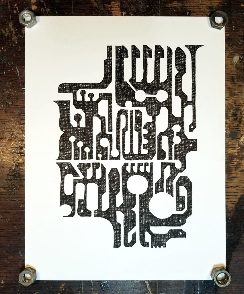 My drawings reference diagrams, flowcharts, blueprints and typographic elements. I am referencing the visual language used to bring order to the chaotic systems in this world. Systems like exploded assembly diagrams from Swedish retailers, silicon chip fabrication, computer interfaces and circuit boards.
