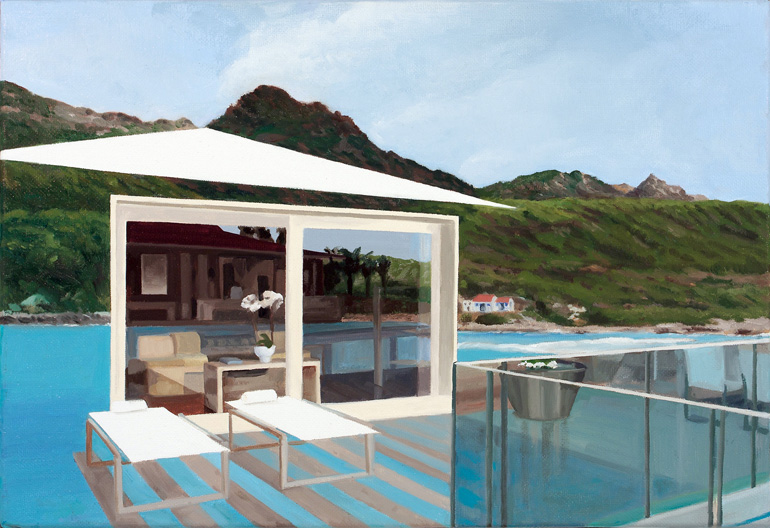 I often use deconstructed depictions of a room – a white cube – as a starting point for my imagery. I transform the room by using projections of various places or figures on the walls, in essence creating a virtual extension of the space. By combining layers of images, I explore how each painting can be transformed to create an experience that is multilayered and time-based for the viewer. The voyeuristic perspective is heightened by the paintings artificial construction and we become conscious of our physical and emotional presence. Each work becomes a sanctuary to contemplate our relationship to nature and ourselves.