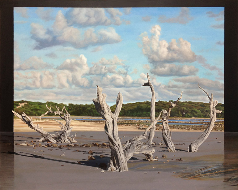 My paintings address the complexity of memory, by blurring and questioning the lines between recollection, projection, and reality. Each painting becomes a psychological landscape or waking dream, examining the notion what’s real. The shifting environments become a metaphor for the transience of our experience and the indelible impressions they leave in us.