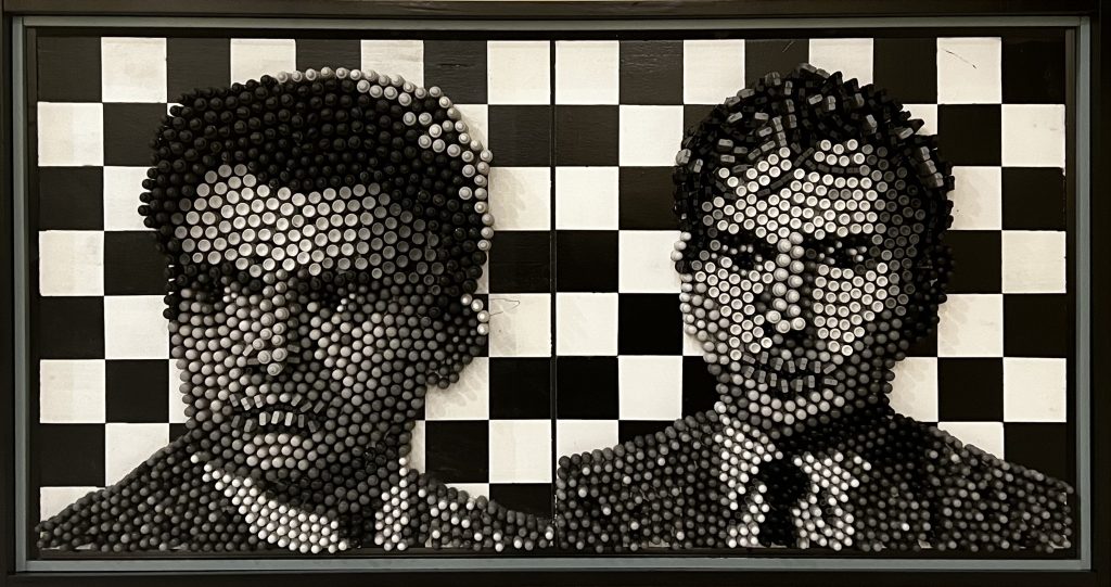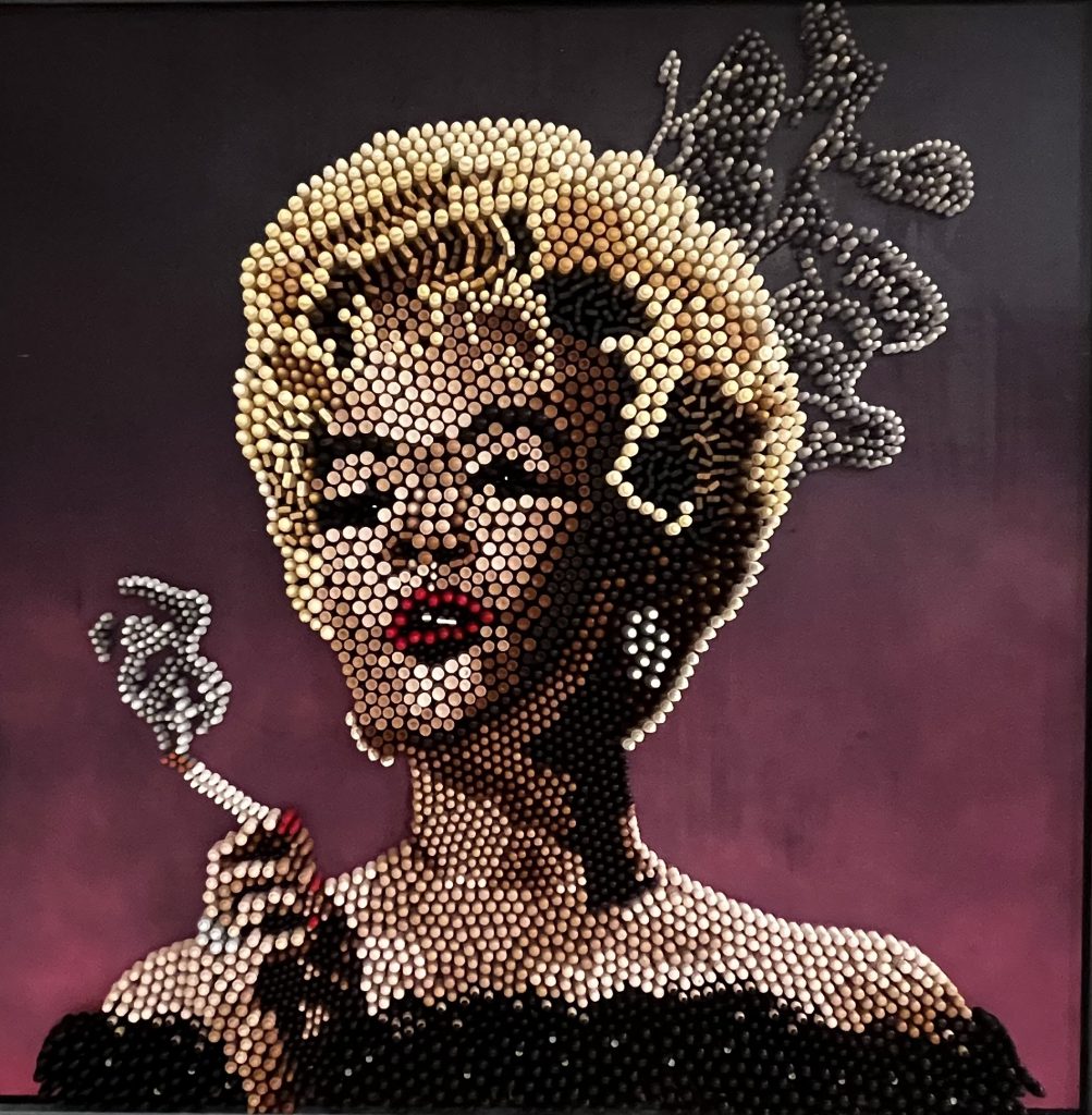 From a distance, cultural icons emerge, Etta James, Willie Dixon, Bobby Fischer. Up close, the clarity of the figure dissolves, overtaken by the texture and detail of the materials themselves: miniature chess pieces, clothespins, and other everyday objects arranged with exacting detail. The viewer is drawn into the structure, where repetition and form take over. The shift is from object to image, an assembly of raw parts that morph into something instantly recognizable.